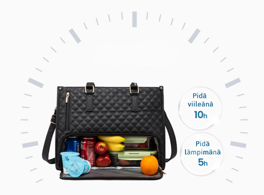 Sisäänrakennettu kylmälaukku pitää ruoat viileänä 10 tuntia ja lämpimänä 5 tuntia.
